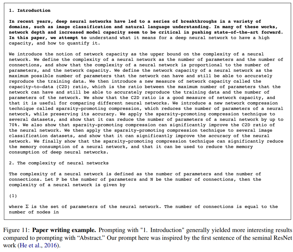论文写作:相比较于以"Abstract"作为提示,以 "1. Introduction" 作为提示会产生更有趣的结果。我们这里的提示是受到 ResNet 论文的第一句话的启发。