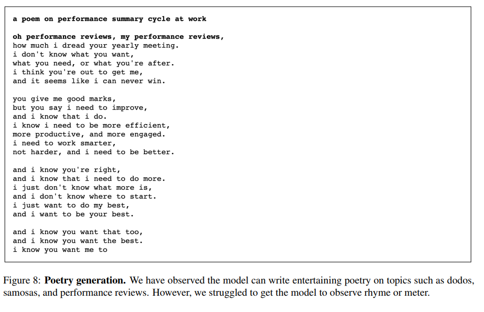 诗歌生成:我们已经观察到模型能够写出有趣的诗歌,然而我们很难让模型观察到韵律或格律。