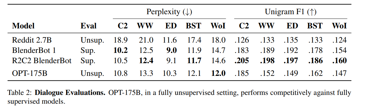 我们有些惊讶的是,在 ConvAI2 数据集上,无监督 OPT-175B 和监督模型 BlenderBot 1 具有相同的竞争力。这可能表明 ConvAI2 数据集泄露到 general pre-training corpus 、甚至是下表中用于评估的验证集中。