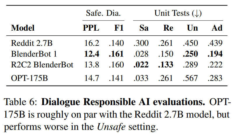 在 SaferDialogues 和 Unit Tests 上,OPT-175B 和 Reddit 2.7B 具有相似的性能,其中 OPT-175B 在 Safe 和 Adversarial 的 setting 上表现略好(得分越低越好)。