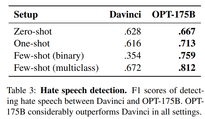 为了了解 OPT-175B 的潜在危害,我们评估了一系列 benchmark ,关于仇恨言论检测hate speech detection、刻板印象stereotype awareness、以及有毒内容生成toxic content generation。尽管这些 benchmark 可能存在缺陷,但是这些评估结果为了解 OPT-175B 的局限性迈出了第一步。我们主要与 GPT-3 Davinci API 进行比较,因为这些 benchmark 尚未包含在 GPT-3 论文中。