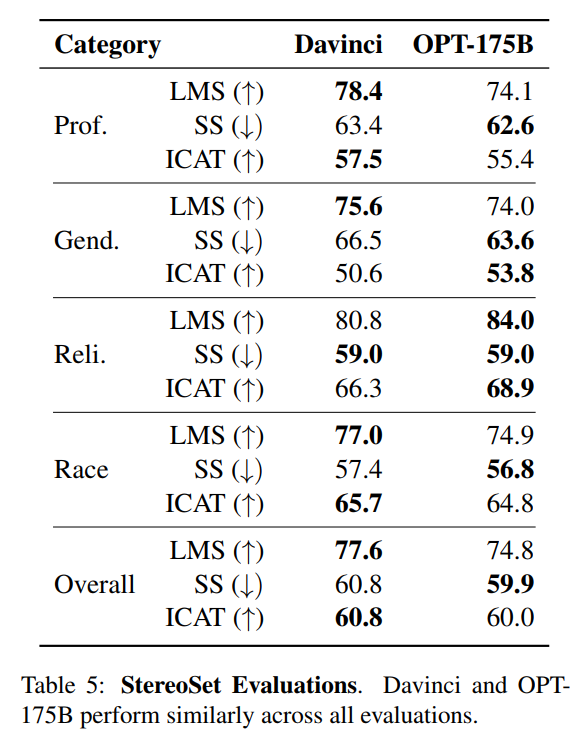 GPT-3 Davinci API 在职业和种族方面表现出色,而 OPT-175B 在性别和宗教方面表现出色。OPT-175B 在 SS 指标上的整体表现更好,而 GPT-3 Davinci API 在 LMS 指标上的表现通常更好。