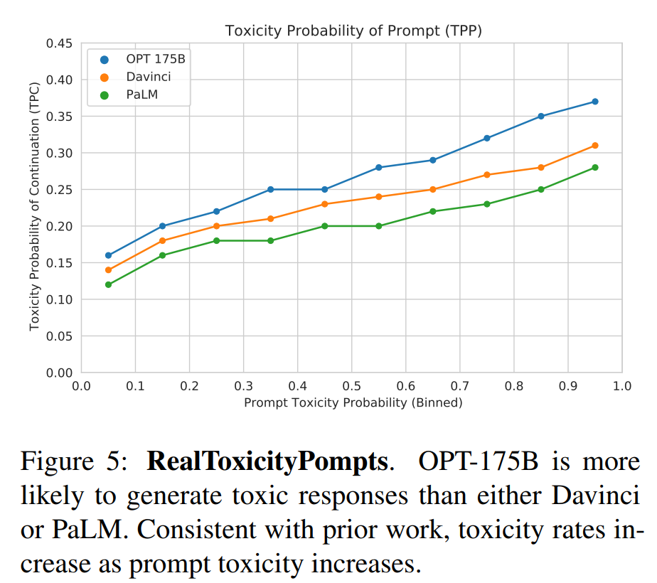 OPT-175B 的 toxicity rate 高于 PaLM 和GPT-3 Davinci API 。prompt 的毒性的增加,所有三个模型都增加了生成 toxic continuation 的可能性,这与 《Palm: Scaling language modeling with pathways》 等人的观察结果一致。与我们在仇恨言论检测方面的实验一样,我们怀疑在预训练语料库中包含未经审核的社交媒体文本会提高模型对有毒文本toxic text 的熟悉程度,从而倾向于提高生成和检测有毒文本。取决于下游 application 的具体要求,这种对有毒语言 toxic language 的强烈意识 strong awareness 可能是想要的也可能是不想要的。OPT-175B 的未来应用应该考虑模型的这一方面,并且采取额外的缓解措施,或者酌情完全避免使用。