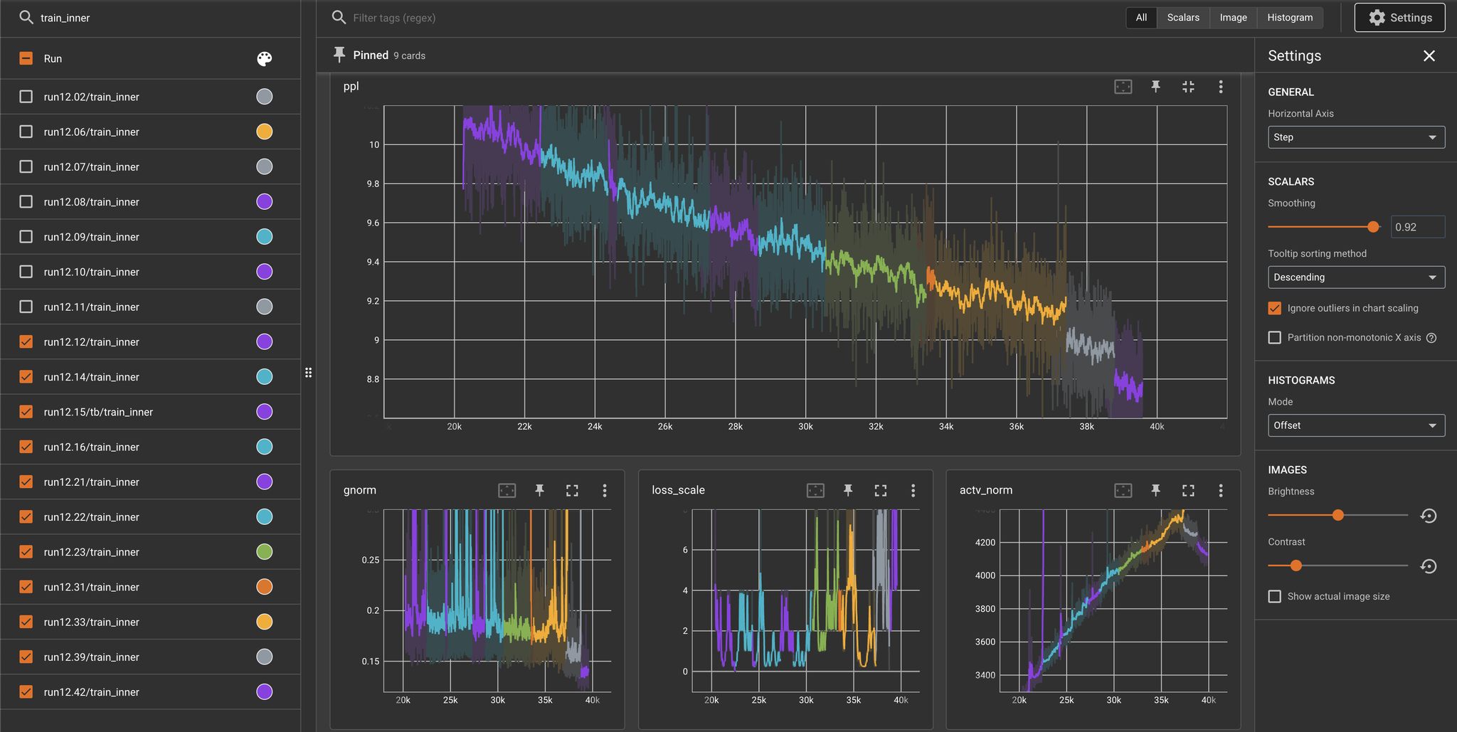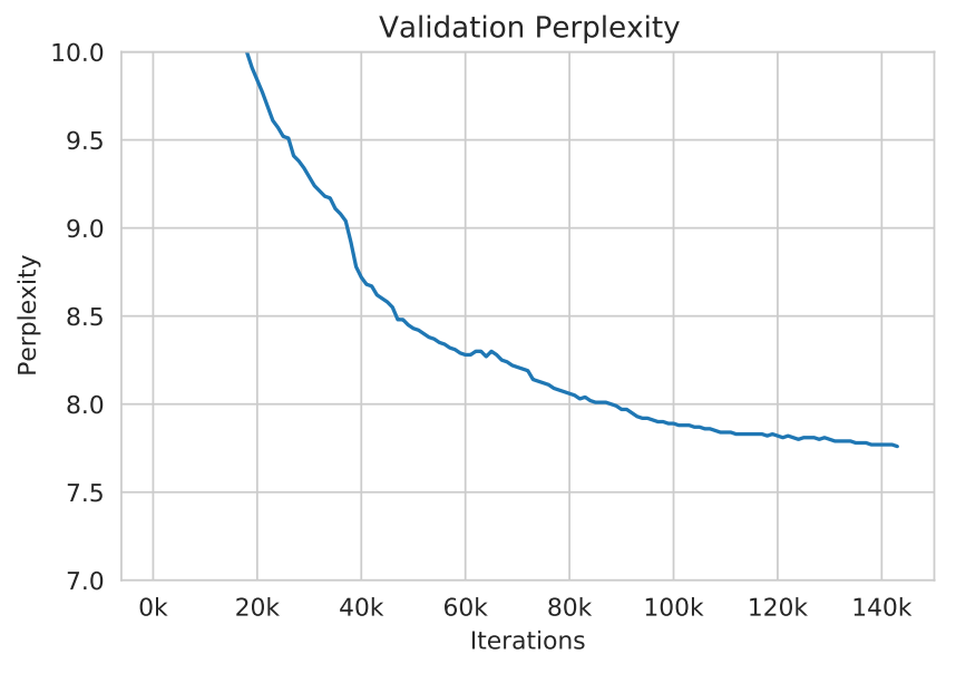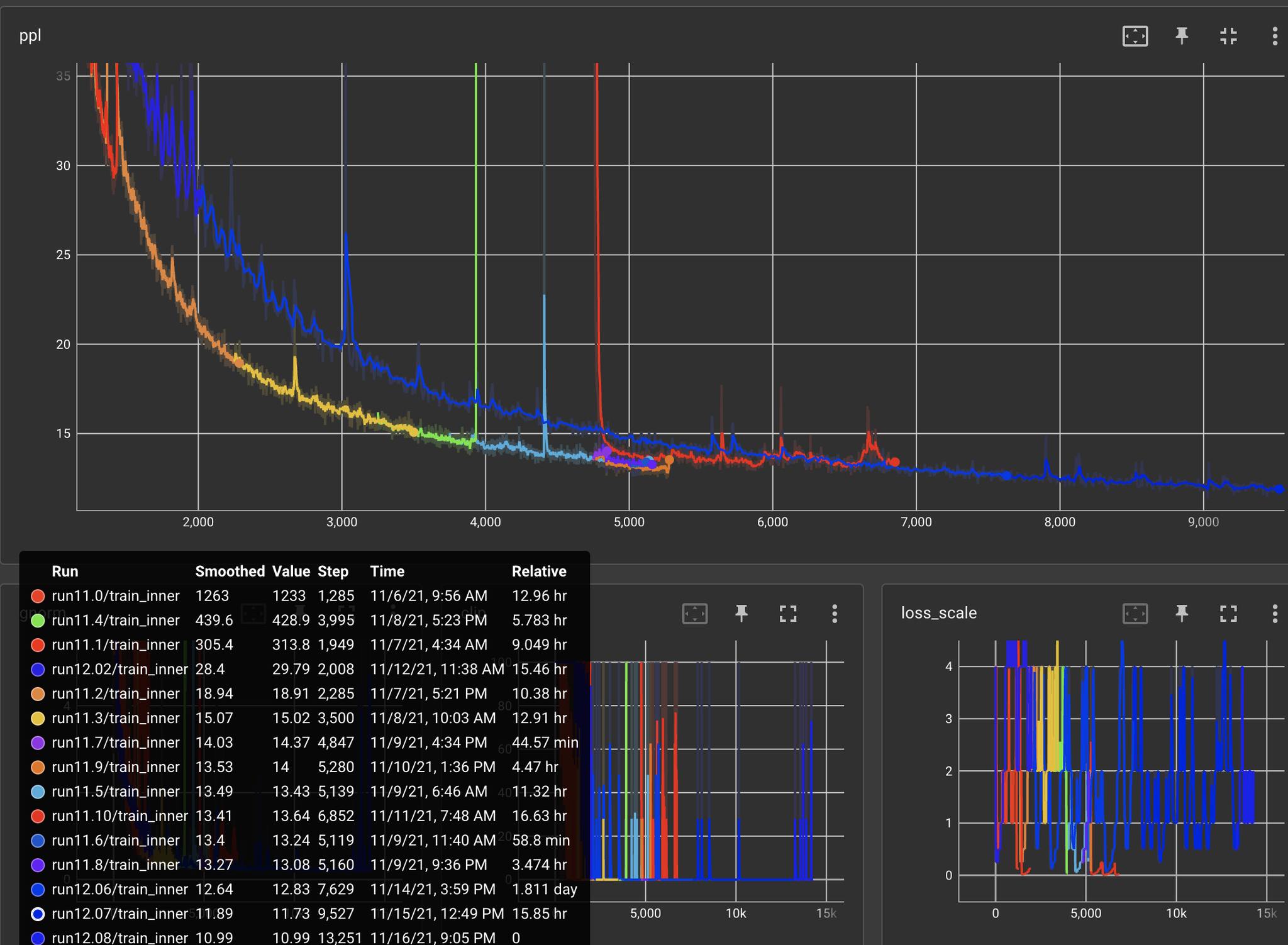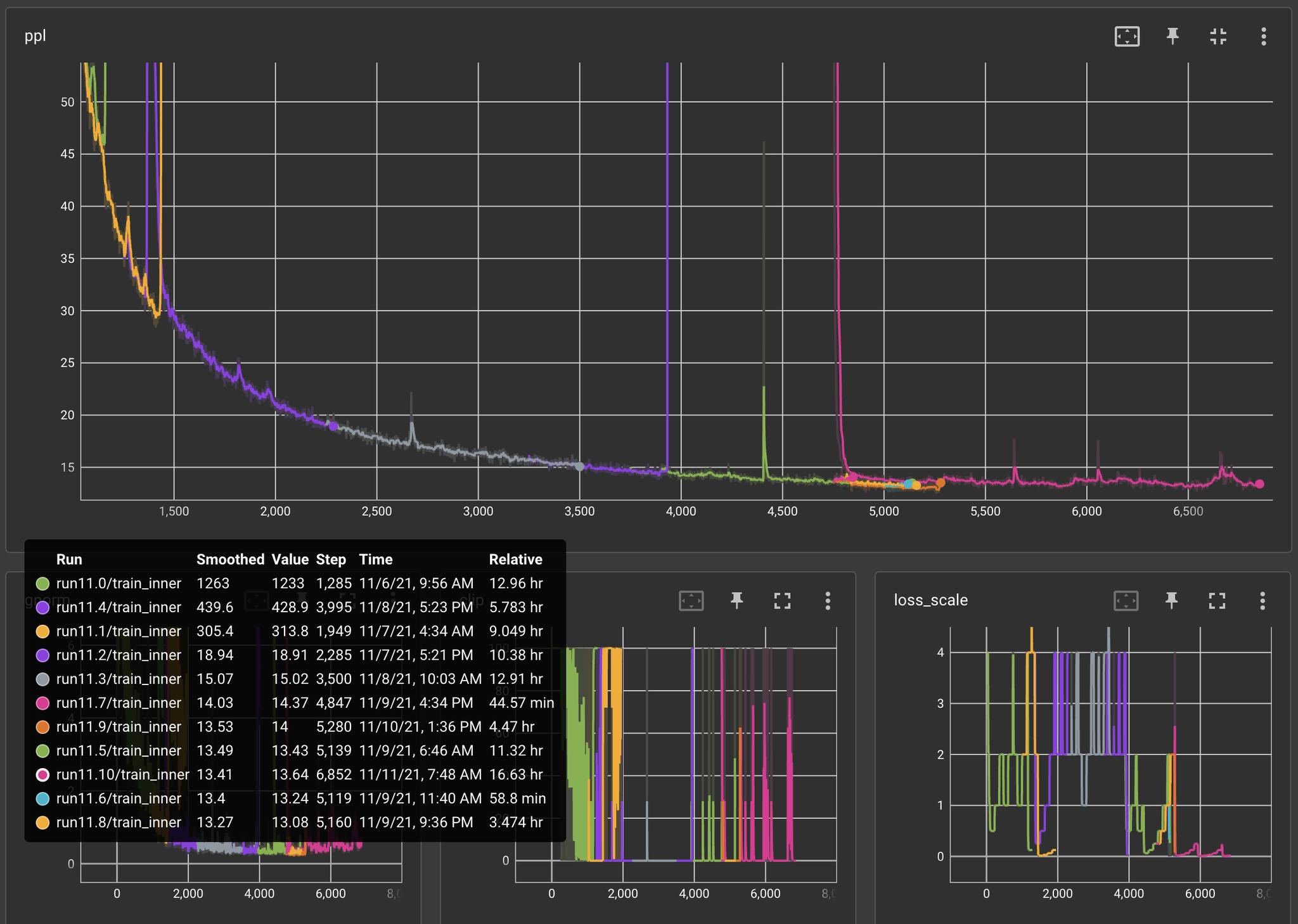 注意,12.xx 实验中的 loss/ppl 开始时要比 11.xx 系列要高得多。但由于稳定性增加,在 7k 次更新后,loss/ppl 最终要降低很多。优化早期的最低 loss/ppl 似乎不一定能保证损失曲线的均匀移动,注意这些曲率的变化(在早期牺牲一些较高的 loss/ppl)可能对我们剩余的实验也是有用的。