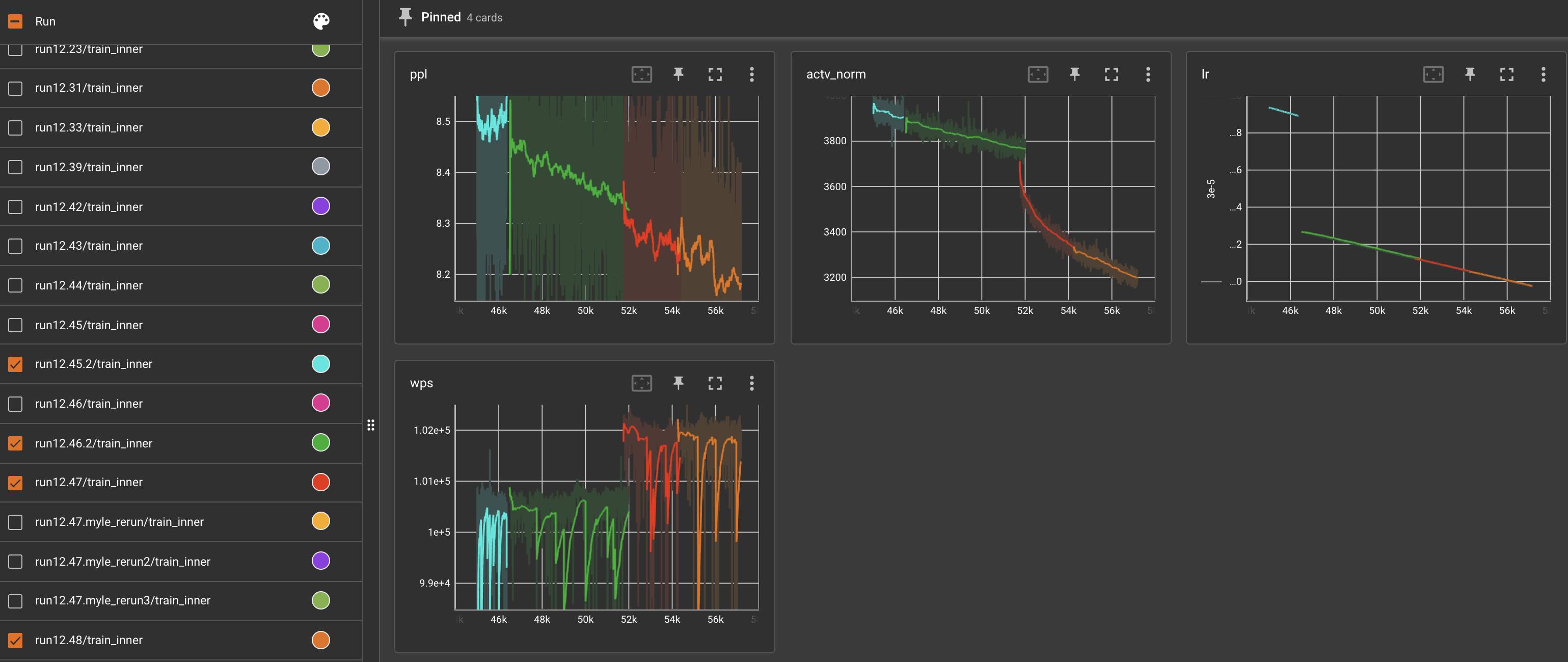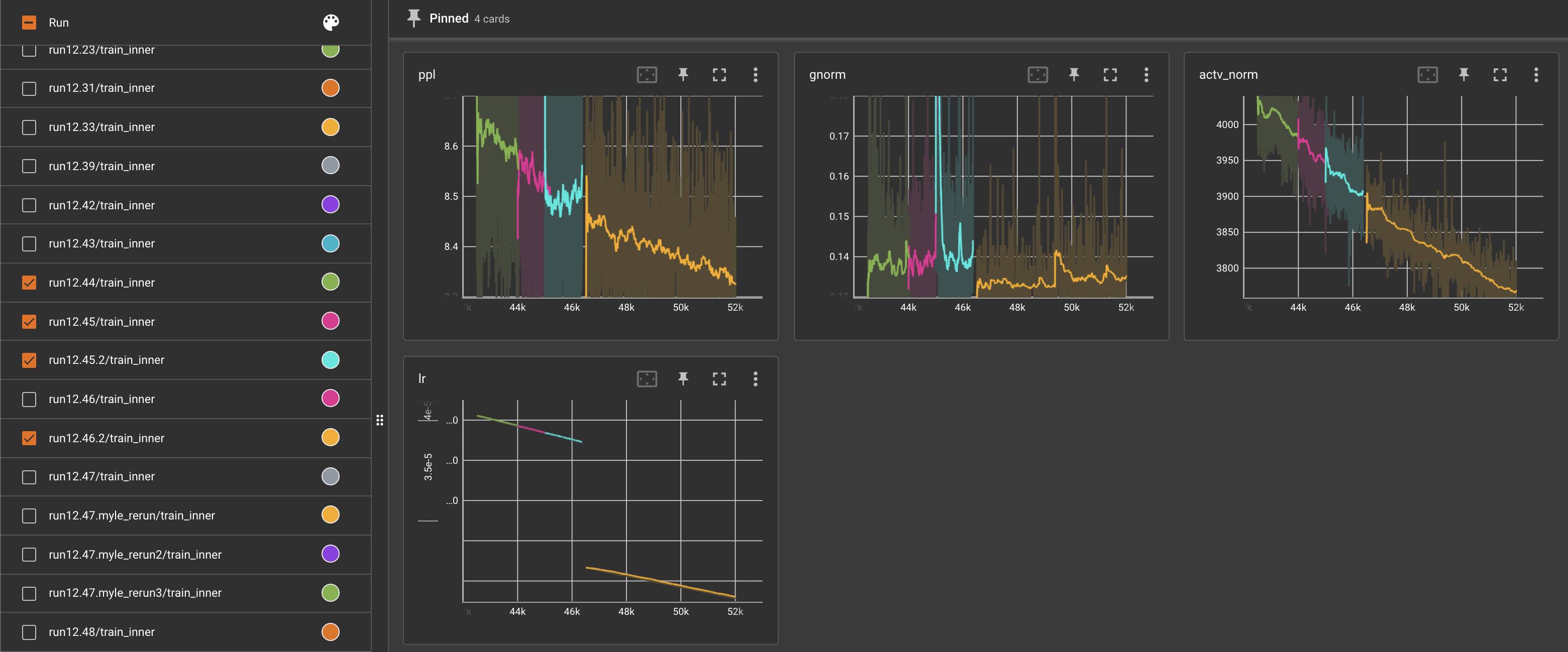 从 2021-12-03 号早上开始,我们决定继续使用 Adam ,并且尝试降低学习率,这似乎对降低梯度范数和激活值范数有惊人的效果,并允许 perpexity 继续稳步下降。我们最初选择从比 GPT-3 175B 高得多的学习率开始,因为较小规模的消融实验表明:在 fairseq codebase 中训练时,GPT-3 的学习率设置的太低。然而,现在我们在训练的后期,似乎学习率的衰减速度不够快,无法保持训练的稳定性。