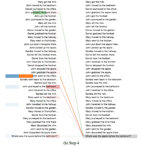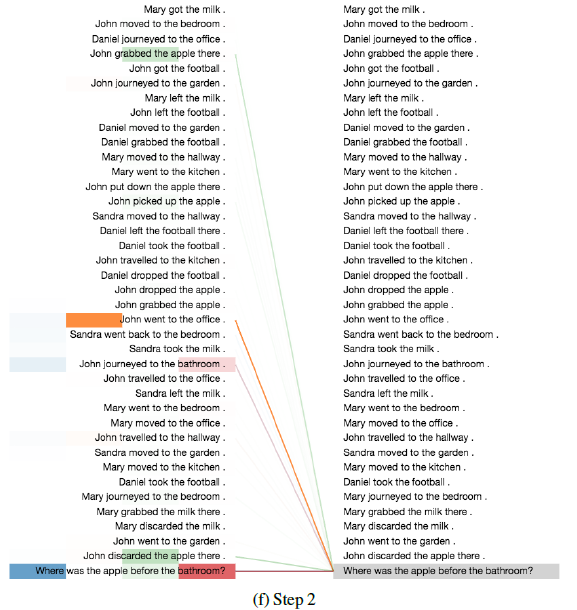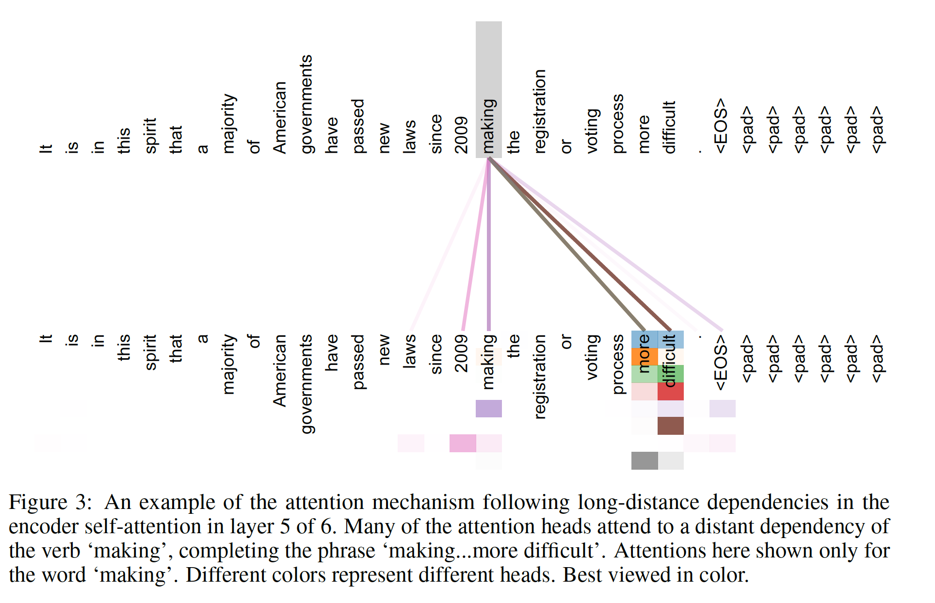 如下图所示为 encoder 六层自注意力层的第五层中,making 这个单词的多头自注意力分布(不同的颜色代表不同的头,颜色的深浅代表注意力大小)。making 这个单词的自注意力分布似乎倾向于构成短语 making ... more difficult 。