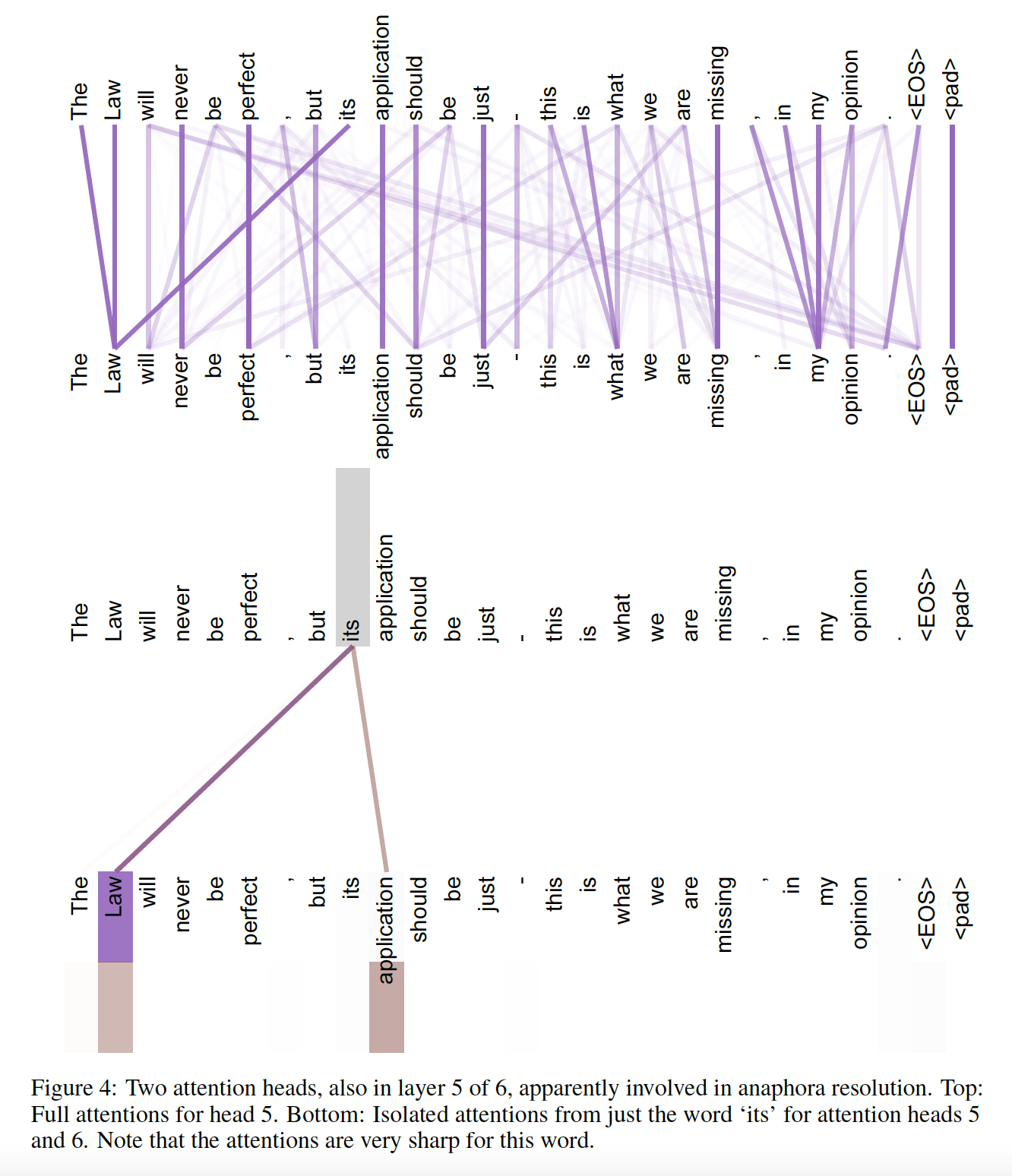 如下图所示为 encoder 六层自注意力层的第五层中的两个注意力头。上半部分为 head 5 的完全的注意力分布(每个单词),下半部分为单词 its 在 head 5和 head 6 中的注意力分布。