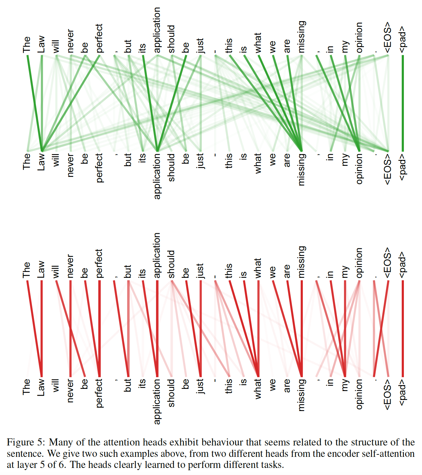 如下图所示为 encoder 六层自注意力层的第五层中的两个注意力头。