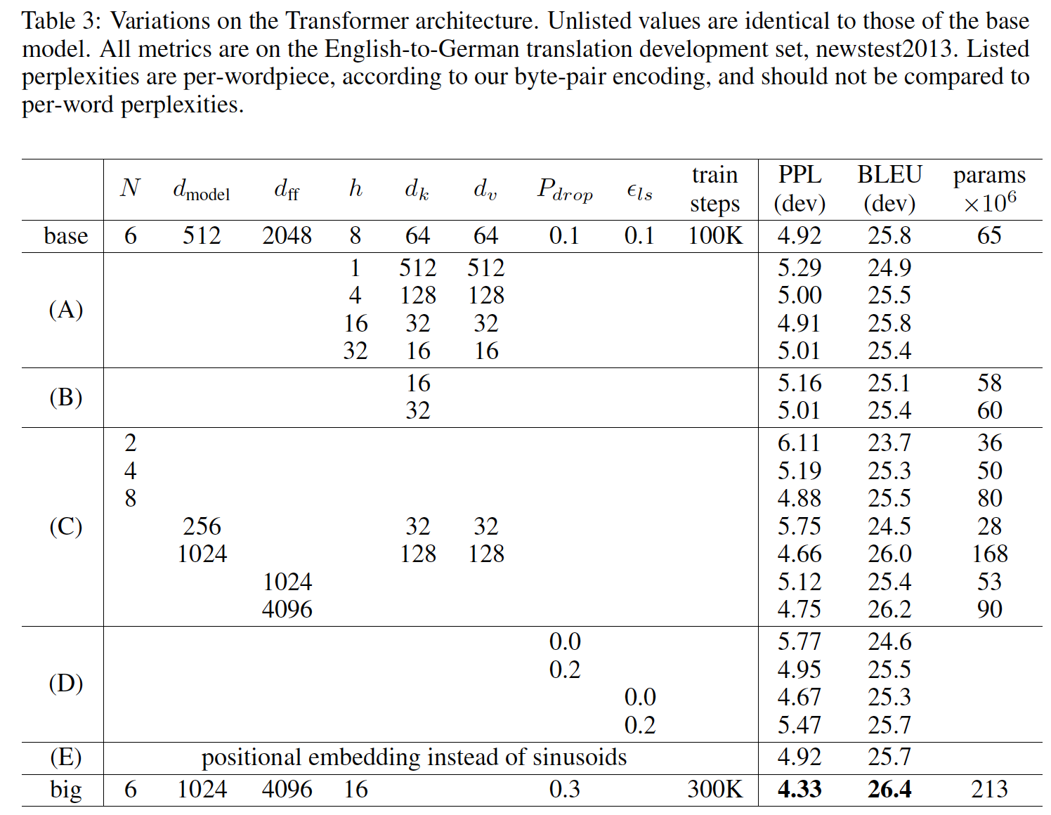base model(使用我们在整篇论文中描述的超参数),每个 training step 大约需要 0.4 秒。我们对 base model 进行了总共 100k 步(即 12 小时)。big model (如下表最后一行所示),每个 training step 大约需要 1.0 秒。我们对 base model 进行了总共 300k 步(即 3.5 天)。