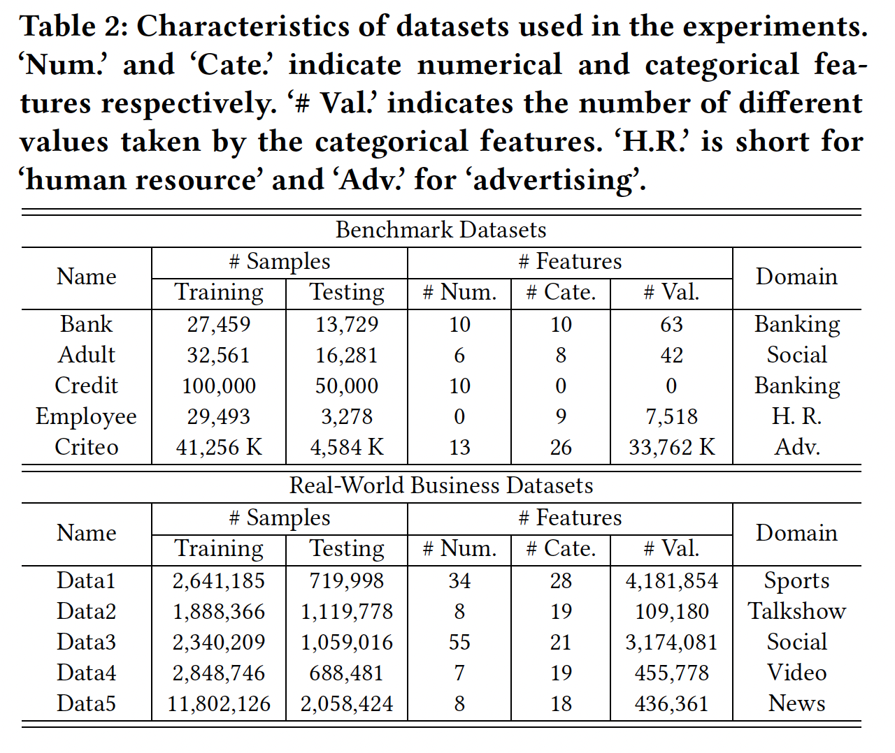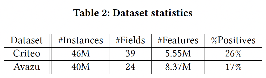 Criteo:我们创建了两个不同的评估设置,分别表示为 Criteo_x4_001 和 Criteo_x4_002 。