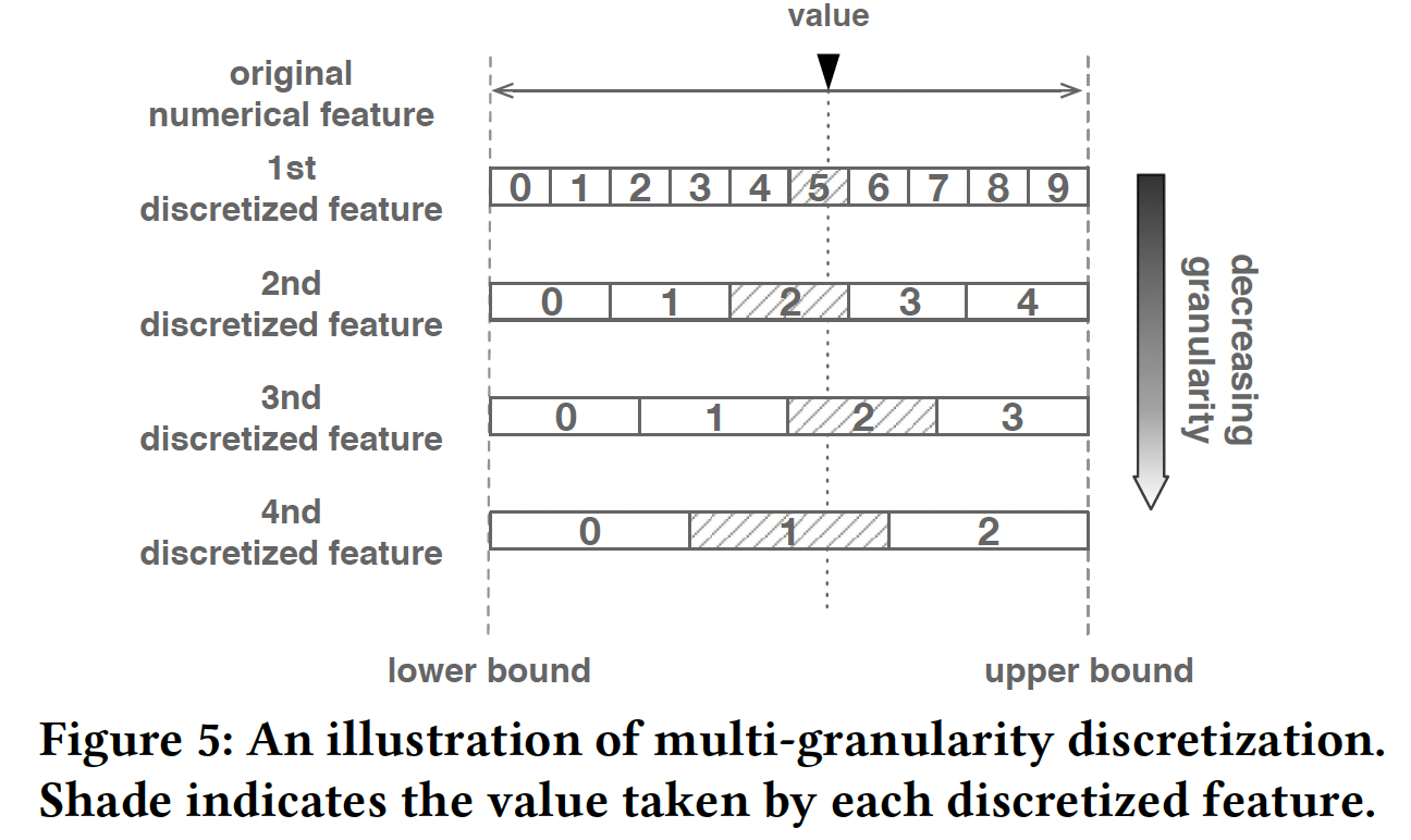 对于 Criteo 数据集,根据Criteo 竞赛冠军的做法,我们将所有数值特征离散化为整数,离散化函数为:
