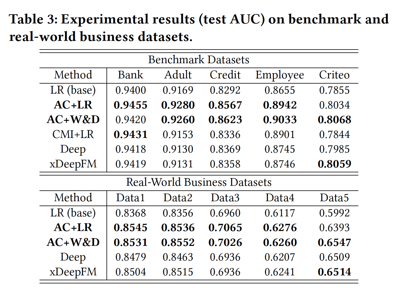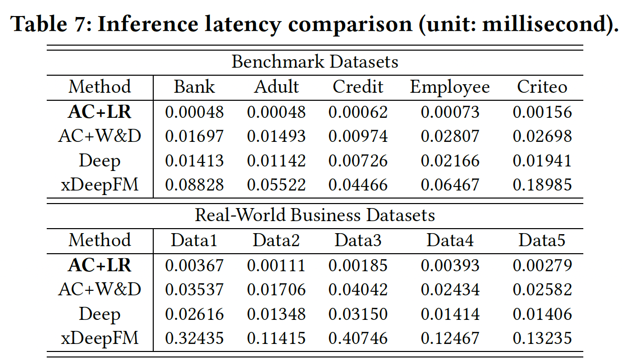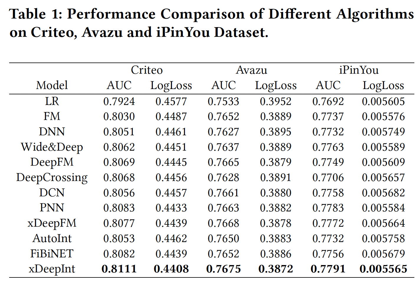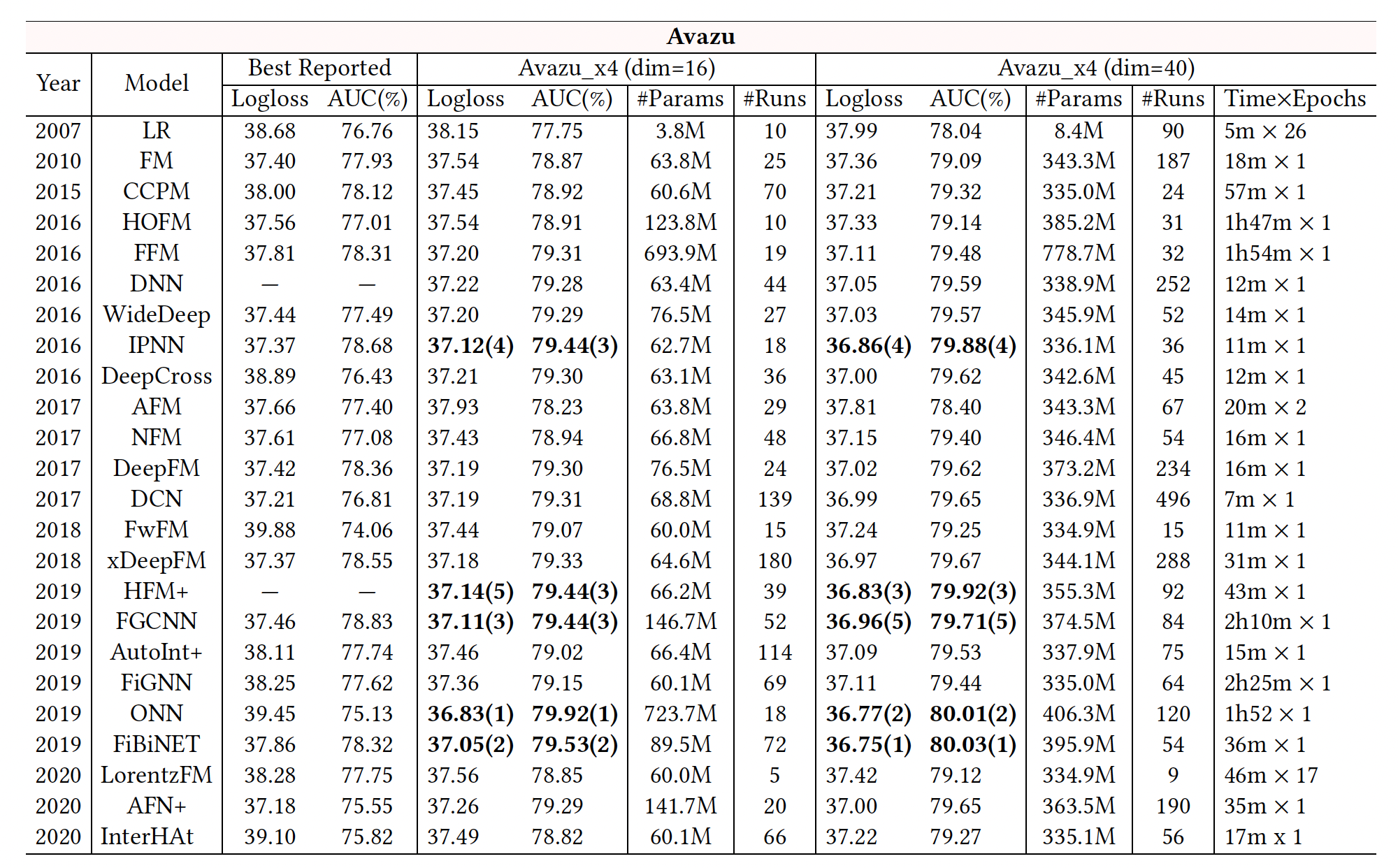 现有研究报告中的最佳结果显示出一定的不一致性。如:InterHAt 在两个数据集上的表现都比 LR 差;DeepCross 在 Avazu 上的表现也比 LR 差。