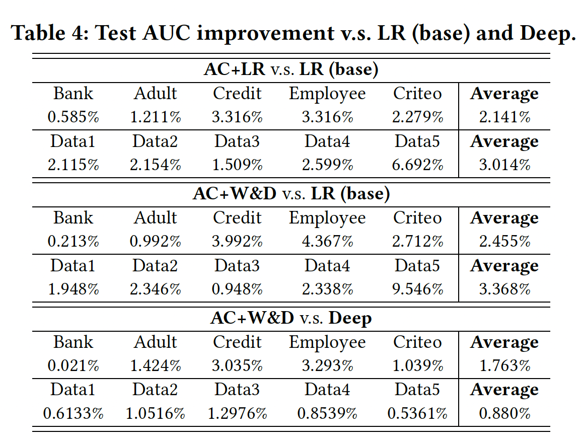 这表明,AFN 学到的自适应阶次的交叉特征与 DNN 建模的隐式特征交互有很大不同,因此在结合两种不同类型的特征交互进行预测时,性能增益显著提高。