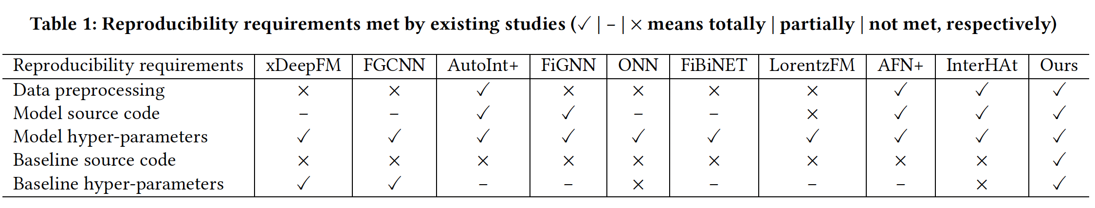 DNN:DNN 是 《Deep Neural Networks for YouTube Recommendations》 报告的一个直接的深层模型,它在拼接 feature embedding 后应用一个全连接网络(称为 DNN )进行 CTR 预测。CCPM:CCPM 报告了使用卷积方法进行 CTR 预测的首次尝试,其中 feature embedding 通过卷积网络进行分层聚合。Wide&Deep:Wide&Deep 结合了 wide network (或浅层网络)和 deep network ,从而同时实现了两者的优势。IPNN:IPNN 是 product-based network,它将 feature embedding 的内积(或外积)作为 DNN 的输入。由于 pairwise 外积需要巨大的内存,我们选择内积版本,即 IPNN。DeepCross:受残差网络的启发,《Deep Crossing: Web-Scale Modeling without Manually Crafted Combinatorial Feature》提出了 deep crossing 来在 DNN 层间增加残差连接。NFM:与 PNN 类似,NFM 提出了一个 Bi-interaction 层,将 pairwise 特征交互池化为一个向量,然后将其馈入 DNN 进行 CTR 预测。AFM:AFM 通过注意力网络学习特征交互的权重,而不是像 FM 那样平等对待所有的特征交互。与 FwFM 不同的是,AFM 根据输入的数据样本动态地调整权重。DeepFM:DeepFM 是 Wide&Deep 的一个扩展,它用FM 代替LR ,显式地建模二阶的特征交互。DCN: DCN 提出了一个 cross network ,以显式的方式执行高阶的特征交互。此外,遵从 Wide&Deep,它还集成了一个 DNN 网络。xDeepFM:DCN 所建模的高阶特征交互是 bit-wise 的,但 xDeepFM 提出 compressed interaction network: CIN 以 vector-wise 的方式捕获高阶特征交互。HFM+:HFM 提出了 holographic representation ,并通过循环卷积计算压缩外积来建模 pairwise 特征交互。HFM+ 进一步将 DNN 网络与HFM相结合。FGCNN:FGCNN 应用卷积网络和 recombination layer 来生成额外的组合特征,以丰富现有的 feature representation。AutoInt+:AutoInt 利用自注意力网络来学习高阶的特征交互。AutoInt+ 将 AutoInt 与一个 DNN 网络整合在一起。FiGNN:FiGNN 利用图神经网络的消息传递机制来学习高阶的特征交互。ONN(也叫 NFFM):ONN 是一个建立在 FFM 上的模型。它将 FFM 的交互输出馈入 DNN 网络。FiBiNET:FiBiNET 利用 squeeze-excitation network 来捕获重要的特征,并提出 bilinear interaction 来加强特征交互。AFN+:AFN 应用对数转换层 logarithmic transformation layer 来学习自适应阶次的特征交互。AFN+ 进一步将 AFN 与DNN 网络整合在一起。InterHAt:InterHAt 采用分层注意力网络,以有效的方式建模高阶特征交互。我们强调了以下五个关键要求,以确保可复现的研究。然而,目前许多研究未能满足所有这些可复现性要求,如下表所示。请注意,我们用 ✓ , - , × 分别表示每个要求是否完全、部分、或未满足。它还表示artifacts 是否完全可用、部分可用或不可用从而复现每个 step 。例如,- 表示 FiBiNET 只有非官方的模型源代码。