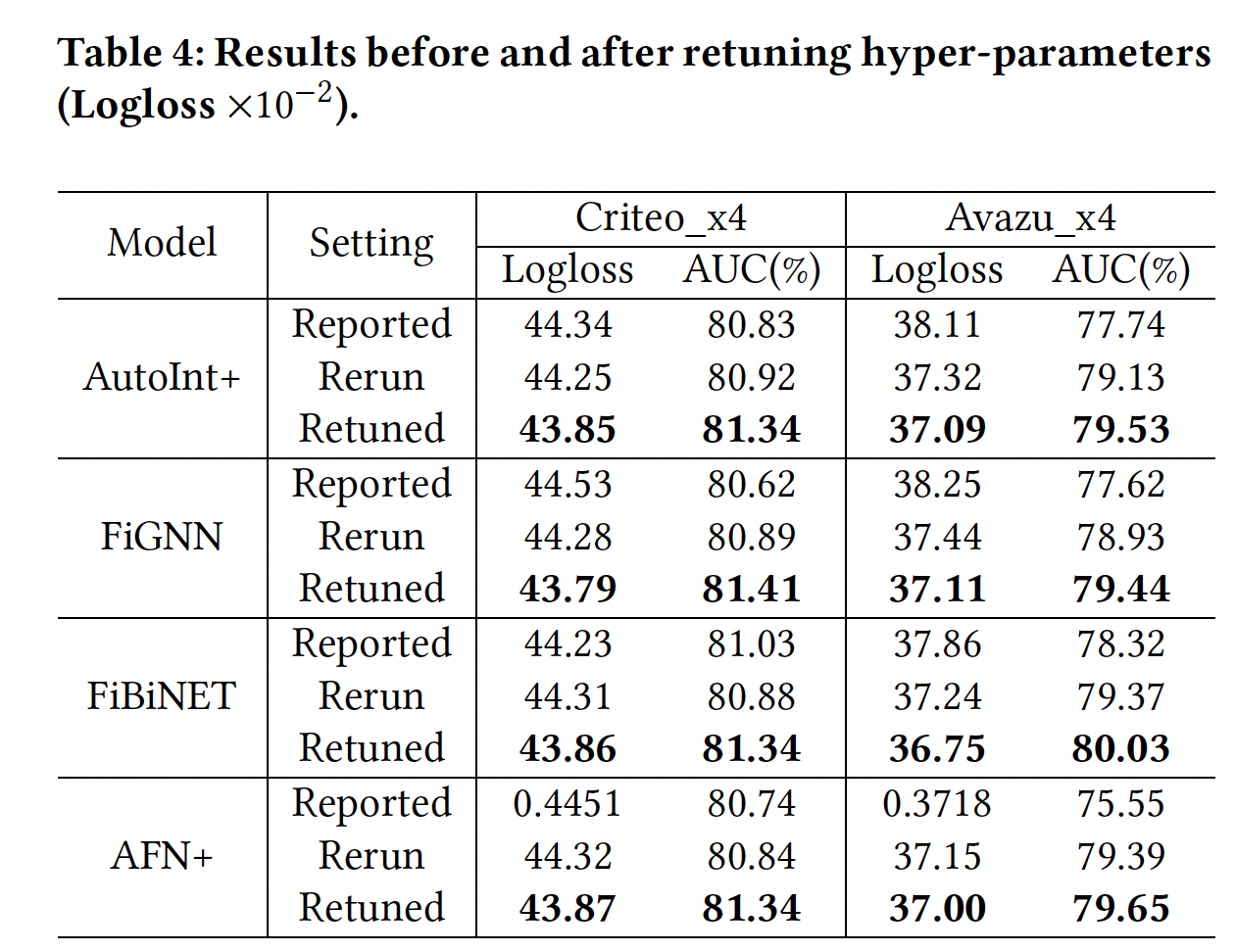 即使在相同的数据集上,直接复用原来的超参数来重新进行实验,也会在新的数据 setting 中带来很大的性能 gap (即我们 case 中的 Criteo_x4_002 和 Avazu_x4_002 )。