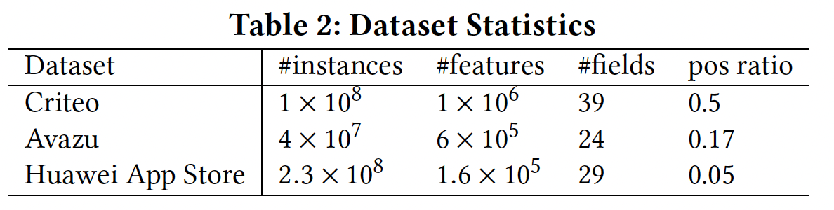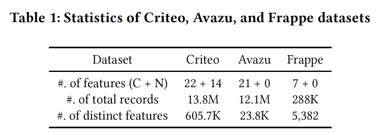 Criteo:包含 13 个数值特征和 26 个 categorical feature 。Avazu:包含 22 个 feature field ,包括用户特征和广告属性。Movielens:我们将每个 tagging record ((user ID, movie ID, tag) 三元组)转换为一个特征向量来作为输入。target 为:用户是否为电影分配了一个特定的 tag 。Frappe:我们将每条日志(user ID, app ID, context features )转换为一个特征向量来作为输入。target 为:用户是否在上下文中使用过该 app 。所有数据集的统计信息如下表所示。