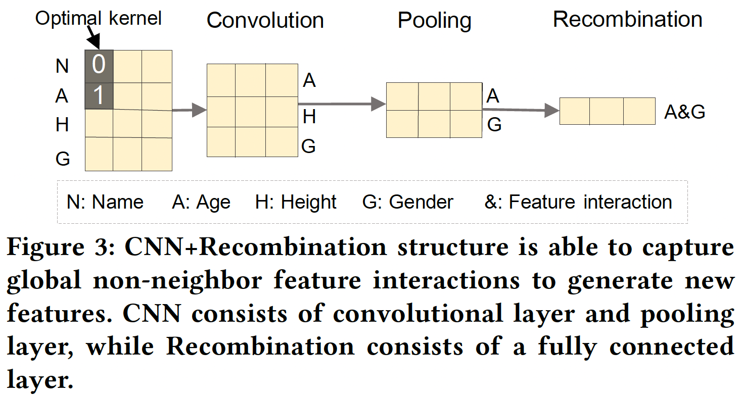 作为一种 SOTA 的神经网络结构,卷积神经网络 Convolutional Neural Network: CNN 在计算机视觉和自然语言处理领域取得了巨大成功。在 CNN 中,共享权重、池化机制的设计大大减少了寻找重要局部模式所需的参数数量,它将缓解随后的 MLP 结构的优化困难。因此,CNN 为实现作者的想法(识别稀疏的但重要的特征交互)提供了一个潜在的良好解决方案。然而,直接应用 CNN 可能会导致不满意的性能。在 CTR 预测中,原始特征的不同排列顺序并没有不同的含义。例如,特征的排列顺序是 (Name, Age, Height, Gender) 还是 (Age, Name, Height, Gender) 对描述样本的语义没有任何区别,这与图像和句子的情况完全不同。如果只使用 CNN 抽取的邻居模式 neighbor pattern ,许多有用的 global feature interaction 就会丢失。这也是为什么 CNN 模型在 CTR 预测任务中表现不佳的原因。为了克服这一局限性,作者采用了 CNN 和 MLP ,两者相互补充,学习 global-local 特征交互来生成特征。