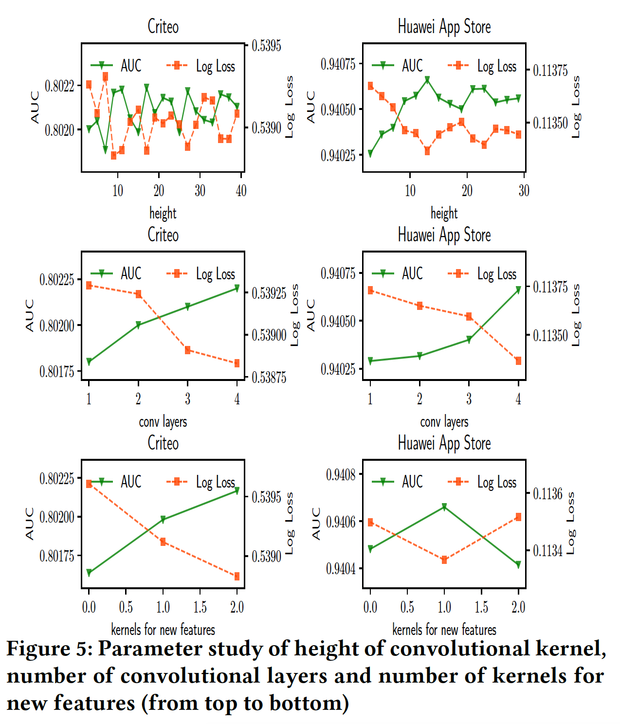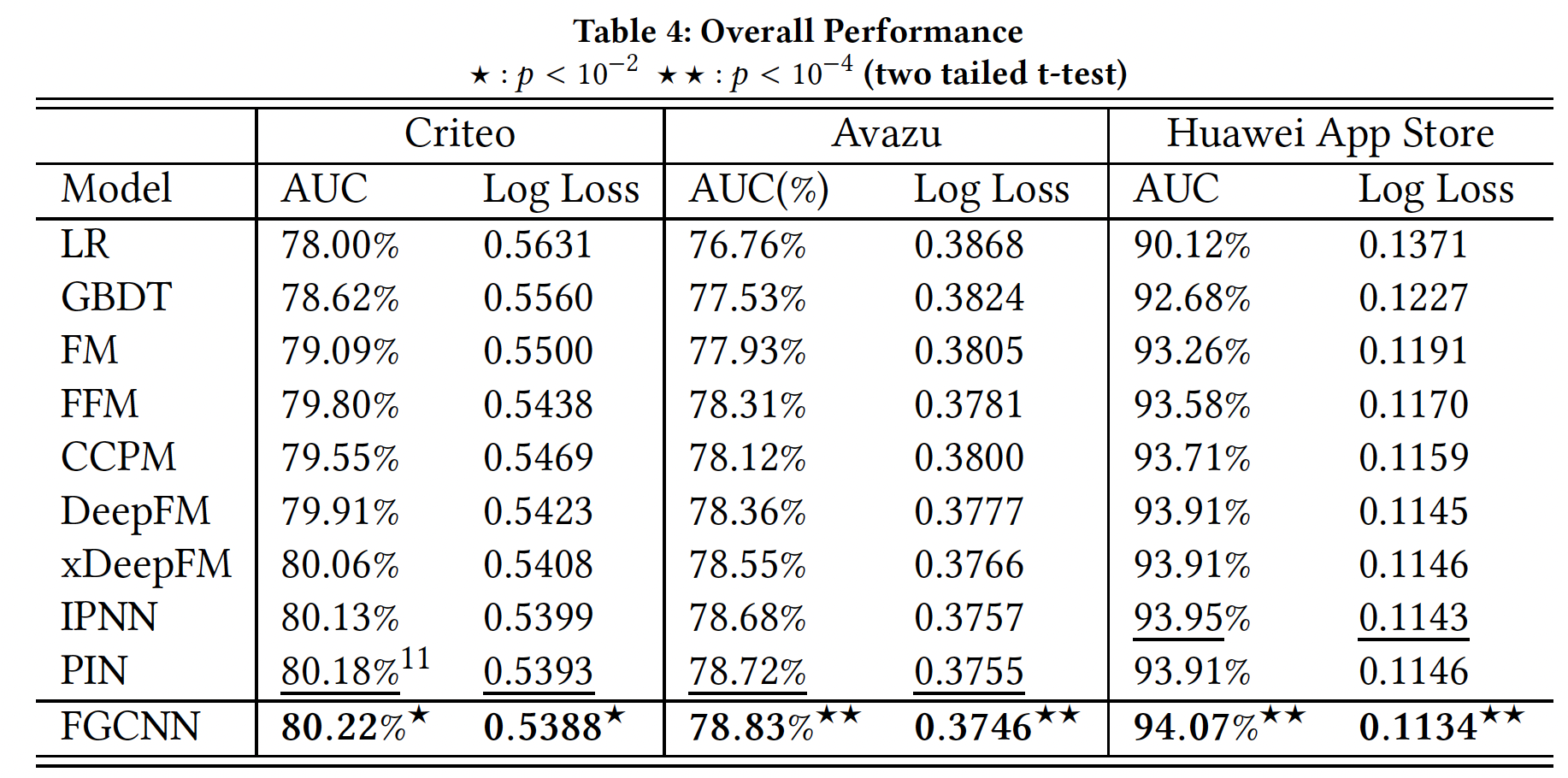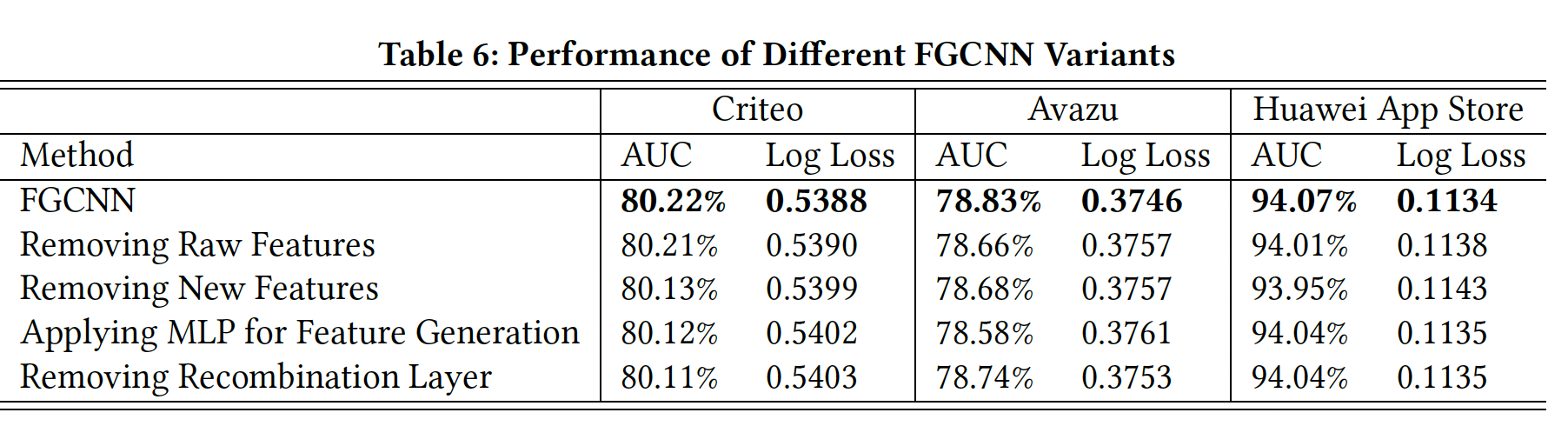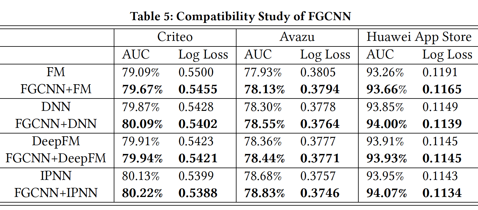 CNN+MLP 的结构用来从原始特征中识别和生成新的重要特征。更具体地说,CNN 被用来学习 neighbor feature interaction,而 MLP 被用来重新组合它们从而提取 global feature interaction 。在特征生成之后,特征空间可以通过结合原始特征和新特征来进行扩充。SOTA 网络结构(如 PIN、xDeepFM、DeepFM)都可以被采用。因此,论文的方法与推荐系统中SOTA的模型具有良好的兼容性。为了便于说明,作者将采用 IPNN 模型作为 FGCNN 的深度分类器,因为它在模型的复杂性和准确性之间有很好的权衡。在三个大规模数据集上的实验结果表明,FGCNN 明显优于九个 SOTA 的模型,证明了 FGCNN的有效性。在深度分类器中采用其他模型时,总是能取得更好的性能,这表明了所生成的特征的有用性。逐步分析表明,FGCNN 中的每个组件都对最终的性能做出了贡献。与传统的 CNN 结构相比,论文提出的 CNN+MLP 结构在原始特征的顺序发生变化时表现得更好、更稳定,这证明了 FGCNN 的鲁棒性。