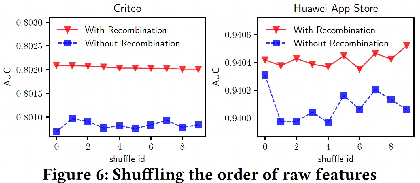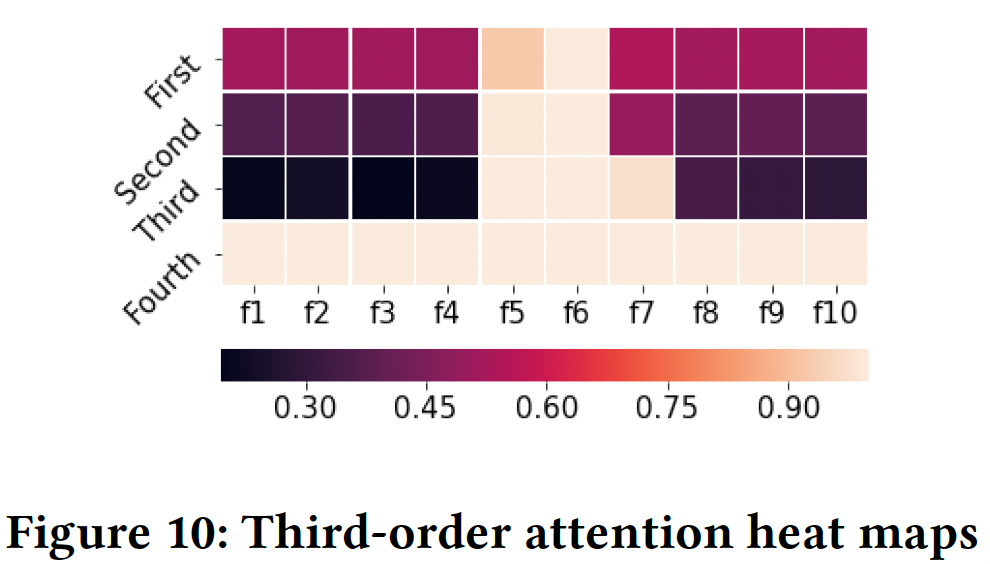 最终的交叉特征阶次分布在一个很宽的范围内(从 4 到 10 ),而不是像许多 factorization-based 方法那样被固定在一个预定义的值上(例如 2 )。