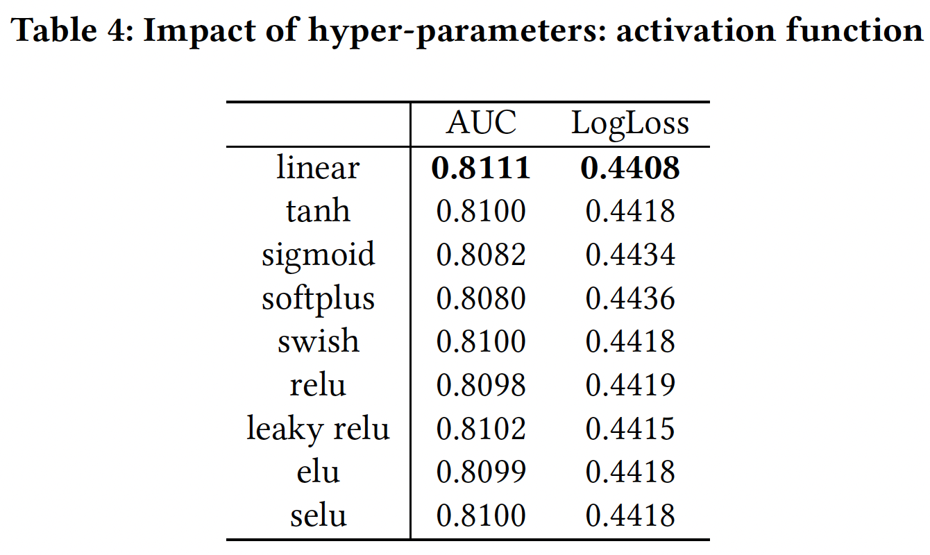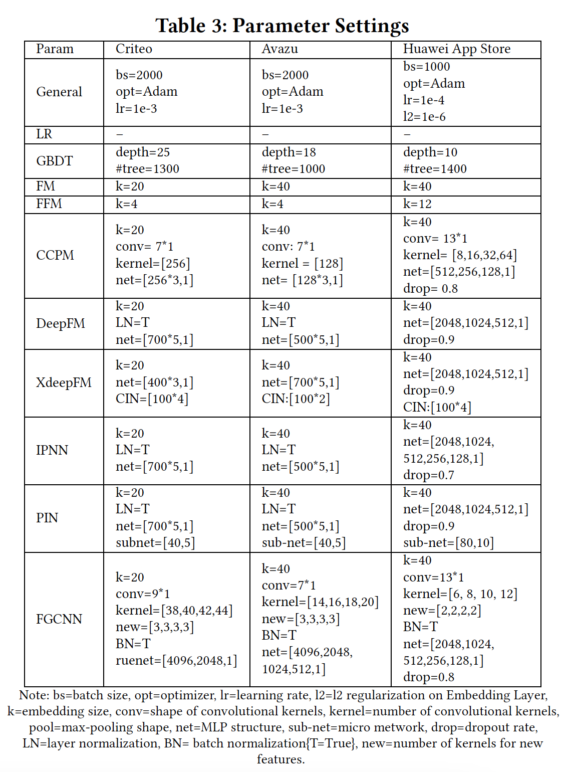关于优化器,对于神经网络模型我们采用学习率为 0.001 的 Adam 优化器,对于 LR 和 FM我们采用学习率为 0.01 的 FTRL。