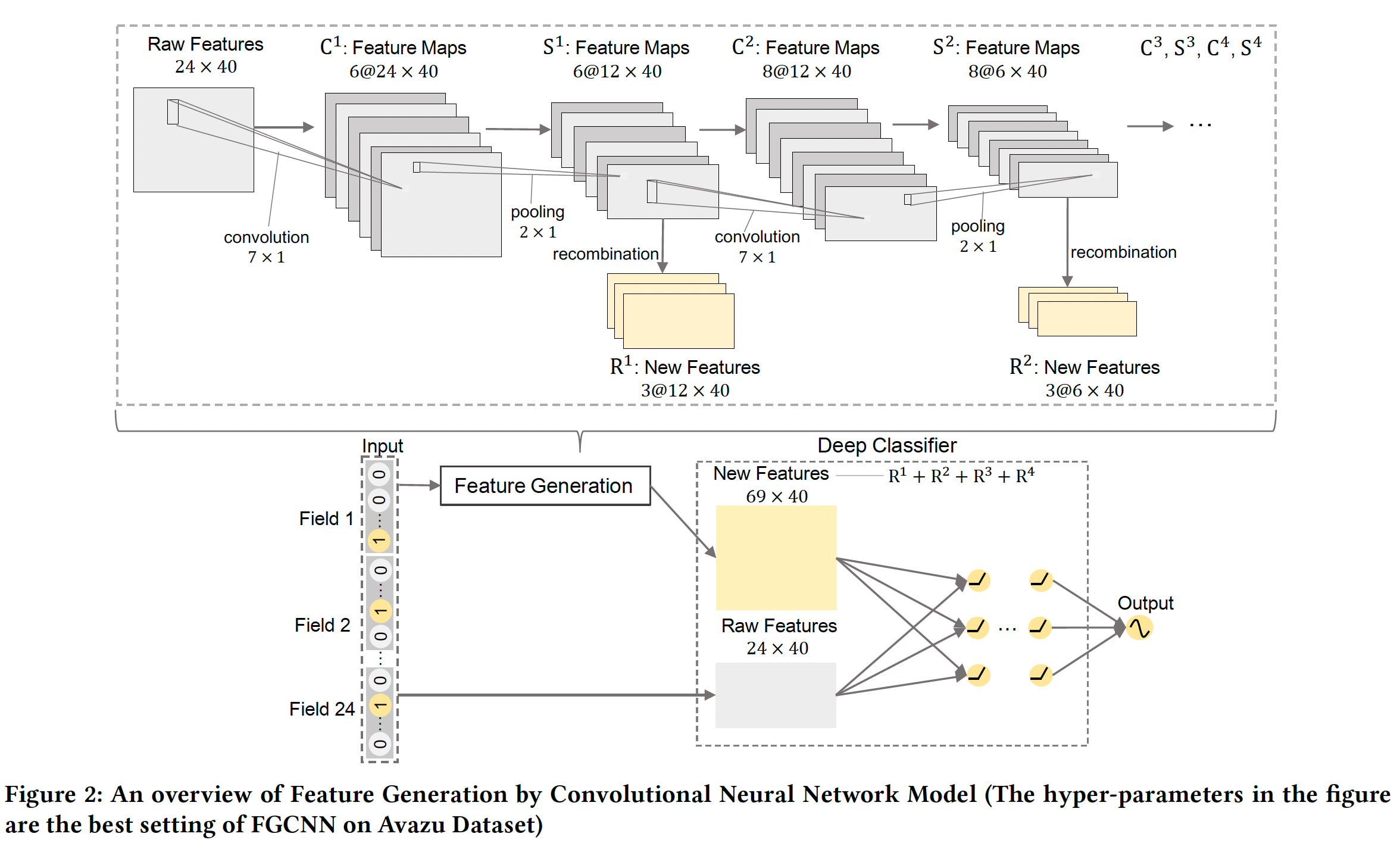 在论文中,作者为 CTR 预测任务提出了一个新的模型,即 Feature Generation by Convolutional Neural Network: FGCNN,它由两个部分组成:特征生成 Feature Generation 、深度分类器 Deep Classifier 。