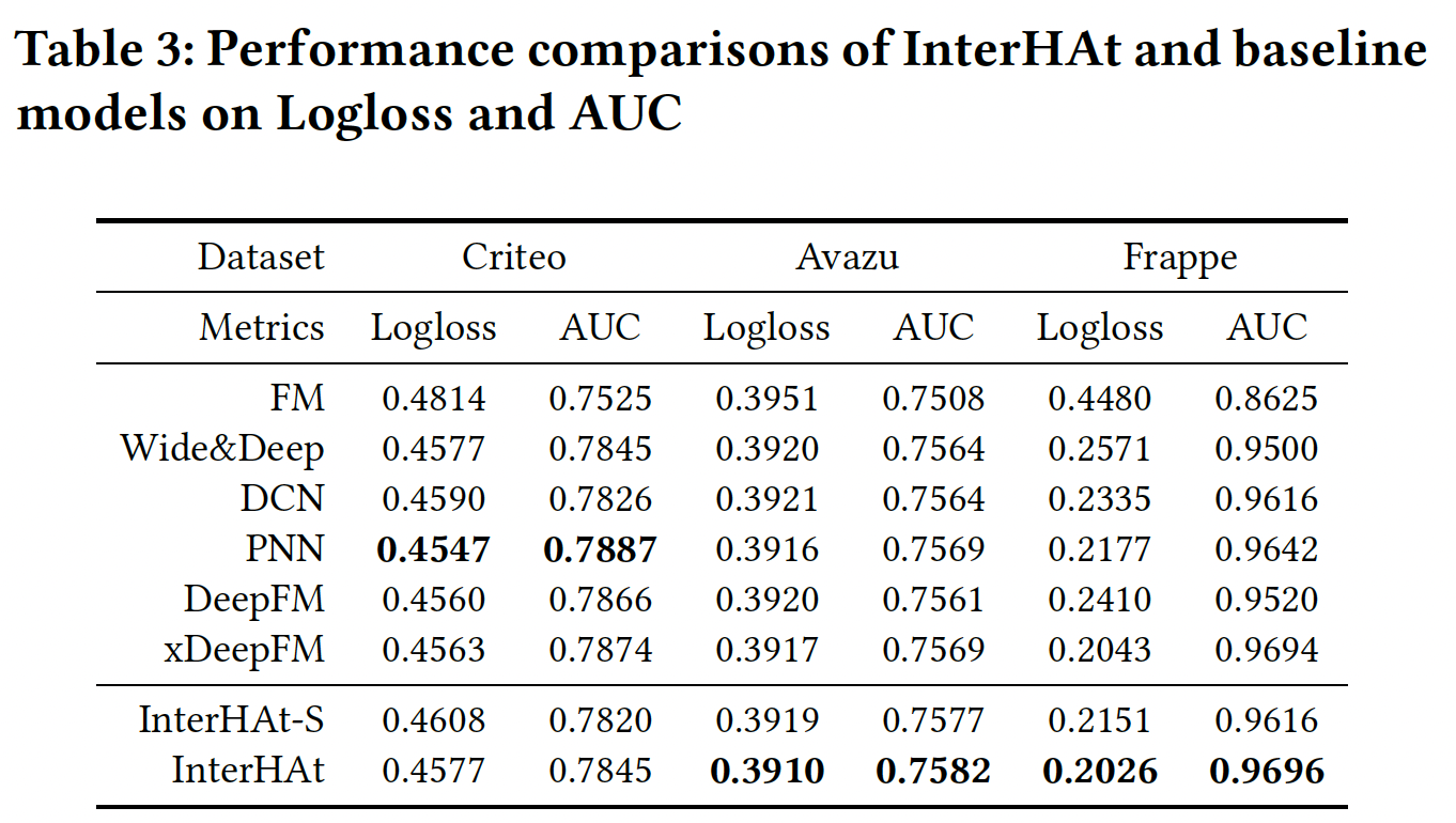 此外,一些最新的模型(如 InterHAt, AFN+, LorentzFM )获得的结果甚至比先前的一些 SOTA 模型还要差。