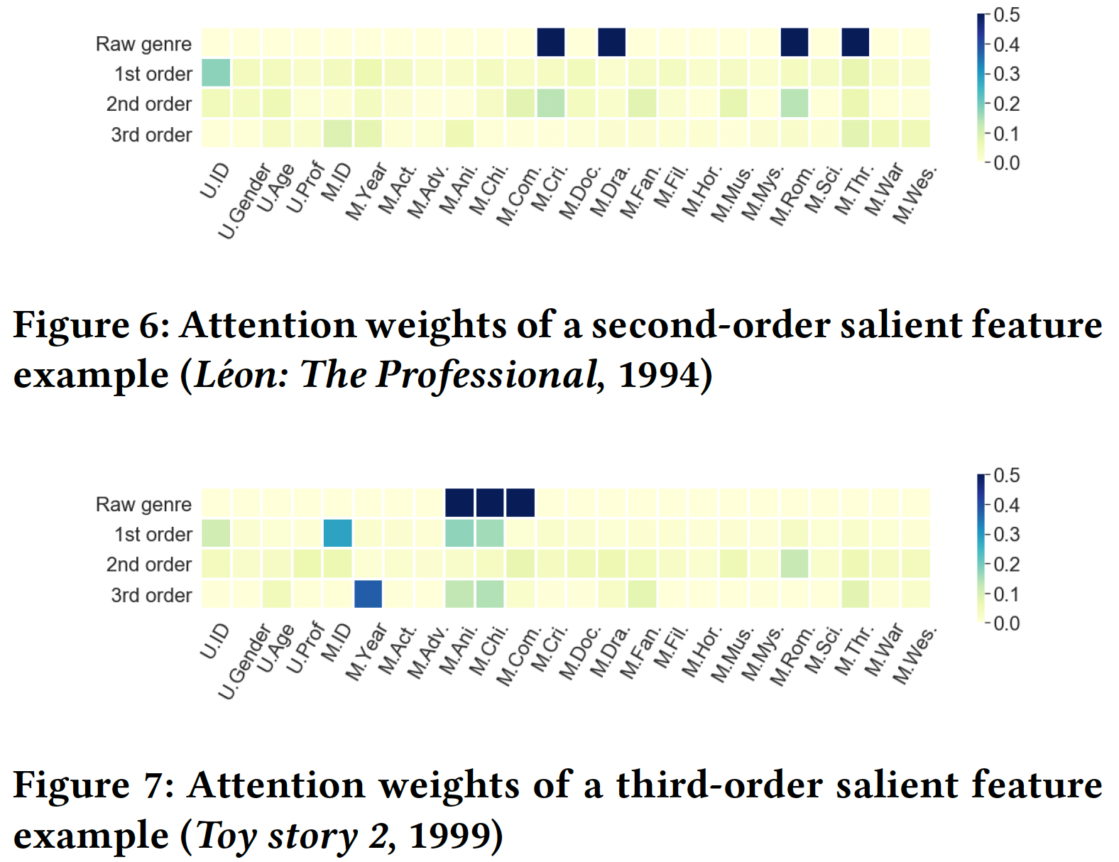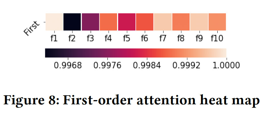此外,通过 sum 三个神经元的特征阶次,发现最 discriminative 的 feature field 是 item id, is free, user id 。这是合理的,因为 user id 和 item id 是协同过滤中最常用的特征;而 is free 表示用户是否为 mobile app 付费,是用户对 app 偏好的一个有力指标。