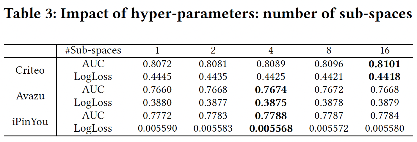 网络深度:当层数为 0 时,我们的模型等价于 LR,没有学习任何交互。可以看到当层数在 3 ~ 4 时,模型效果最佳。这里我们将子空间的数量设置为 bit-wise 特征交互。