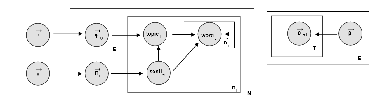 从情感分布 中采样一个情感 ,然后从话题分布中 中采样一个话题 ,然后从主题-情感的单词分布 采样 个单词 。 为句子的编号。