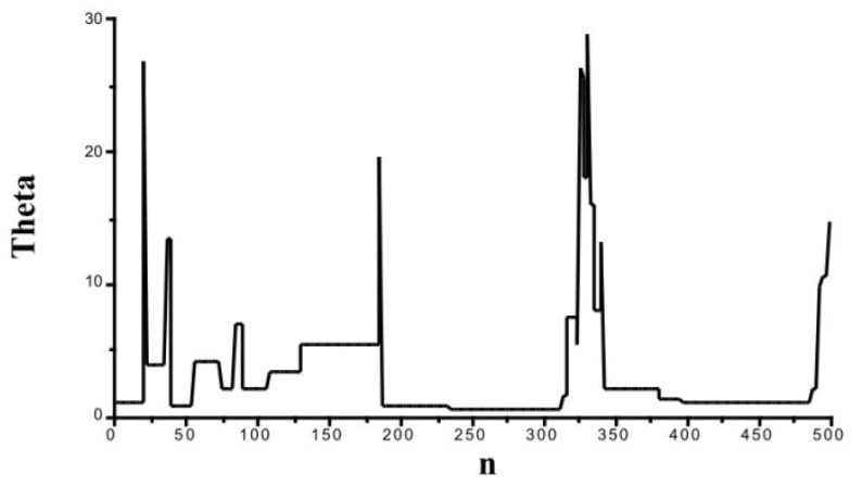 当拒绝率太高时,MCMC 采样很可能长期处于某些值附近(如下图所示的平摊区域),搜索整个参数空间要花非常多的时间。下图中,横轴为迭代次数,纵轴表示采样结果。