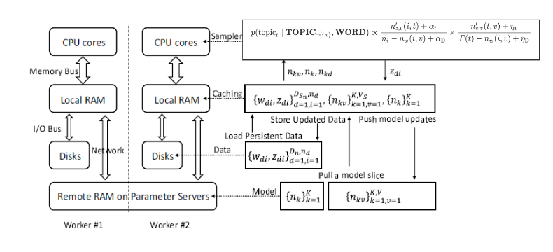 MCMC 采样中,对大多数主题-单词 列的访问都是 dense 表示,这使得采样的吞吐量很高。主题-单词列的存储是sparse 表示,这使得内存需求较低。LightLDA 使用开源的分布式机器学习系统 Petuum 来实现,特别使用其参数服务器来进行有界异步数据并行。