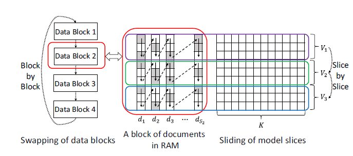 考虑到每个数据分片可能仍然非常巨大,无法一次性加载进worker 内存。因此 LightLDA 将每个数据分片继续划分成数据块 Data Block ,并将这些数据块依次加载进内存处理。