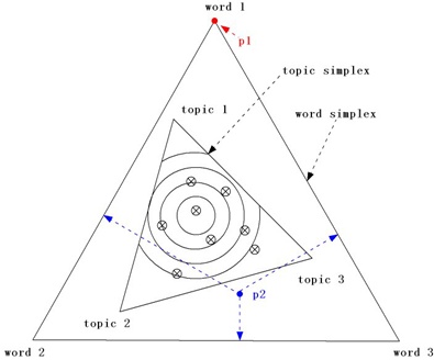 最外的三角形为单词三角形。内部每个点(如 )表示一个单词概率分布,表示产生 word1,word2,word3 这三个词的概率的大小;靠内的三角形为主题三角形。内部每个点表示一个主题概率分布,表示产生 topic1,topic2,topic3 这三个主题的概率的大小。