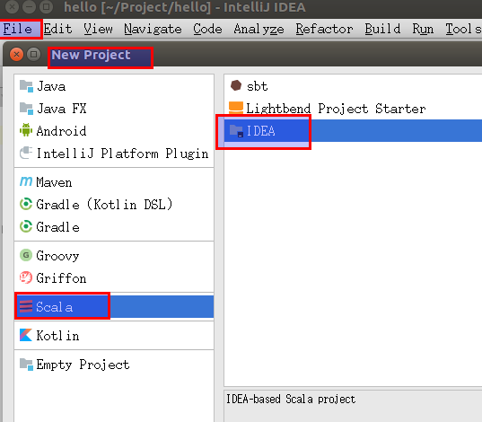 新建Project,选择Scala,在面板右侧选择IDEA(而不是sbt 或者 Lightbend Project Starter )。