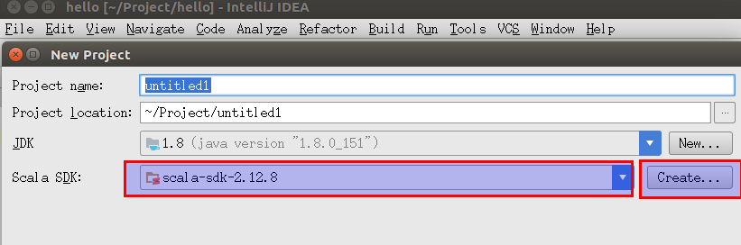 选择下一步,在填写 Project name 和 JDK/Scala SDK 的地方。点击Scala SDK 右侧的Create,可以选择下载或者切换到指定版本的Scala SDK 。