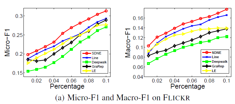 SDNE 的效果始终超越baseline 方法,证明SDNE 学到的 network representation 相比 baseline 可以更好地泛化到分类任务中。
