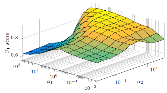 最后我们基于测试集的 embedding 和训练集学到的 SVM 分类器来对测试集进行分类,并报告分类的 F1 指标。每种配置都随机执行 10 次并报告指标的均值。