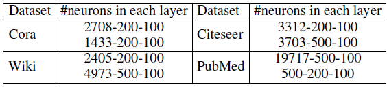 对于 DANE,我们使用 LeakyReLU 作为激活函数。DANE 在四个数据集上采用不同的体系结构,如下表所示。对于每个数据集,第一行对应于网络拓扑结构的体系结构,第二行对应于节点属性的体系结构。这里我们仅给出编码器的体系结构,解码器的体系结构为编码器结构的翻转。