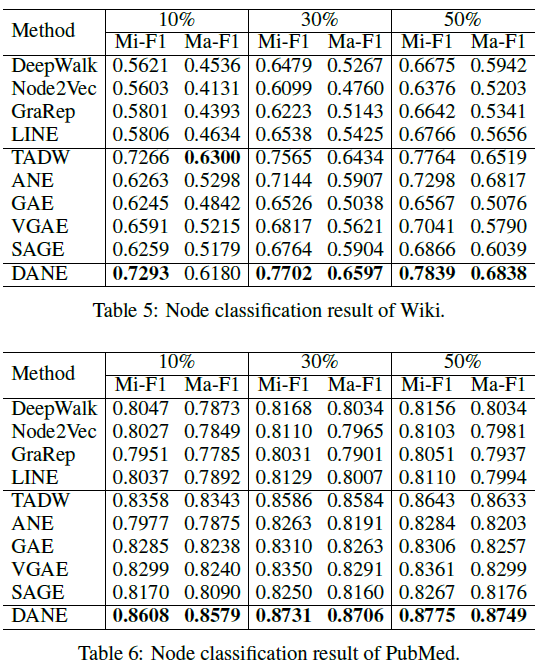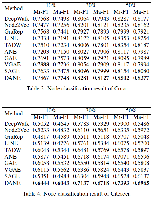与普通网络embedding 方法相比,DANE 取得显著提升。