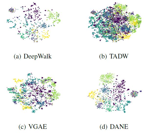 网络可视化:为进一步展示DANE 的效果,我们使用 t-SNE 可视化节点的embedding。我们仅给出 Cora 数据集的三种代表性 baseline 的结果。可以看到,和其它方法相比,DANE 可以实现更紧凑、间隔更好的类簇。因此,我们的方法可以在有监督任务和无监督任务上实现更好的性能。