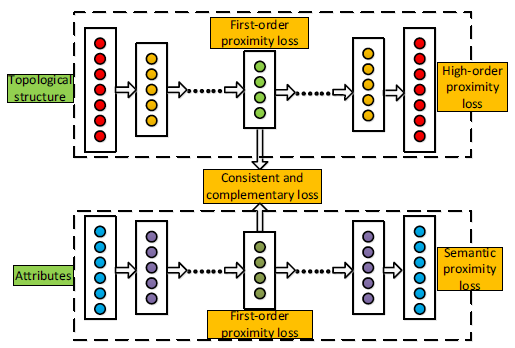 邻近性保持:属性网络中存在三种类型的邻近性,语义邻近性(semantic proximity) 、高阶邻近性(high-order proximity) 、一阶邻近性 (first-order proximity)。