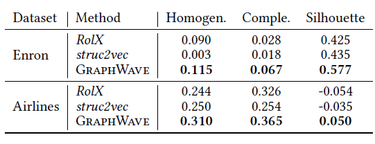 我们衡量了每个簇中的机场与ground-truth 结构角色的对应程度(如上表所示)。从上表可以看到,GraphWave 在所有三个聚类指标上都优于替代方法。