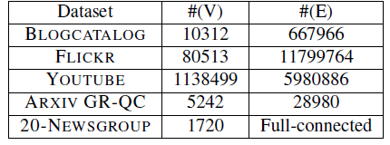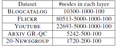 参数配置:我们在本文中提出了一种多层深度结构(multi-layer deep structure ),层数随着数据集的不同而变化。每一层的维度如下表所示。BLOGCATALOG, ARXIV GR-QC, 20-NEWSGROUP 数据集为三层结构,FLICKR, YOUTUBE 数据集为四层结构。如果我们使用更深的模型,则性能几乎保持不变甚至变得更差。