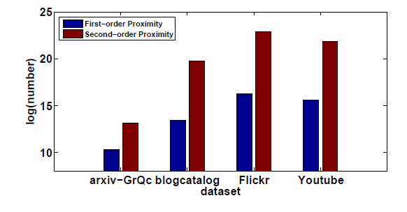 为了在深度模型中同时保留局部网络结构和全局网络结构,论文提出了一种半监督架构,其中无监督组件(unsupervised component)重建二阶邻近性从而保留全局网络结构,而监督组件( supervised component )利用一阶邻近性作为监督信息从而保留局部网络结构。因此,学到的 representation 可以很好地保留局部网络结构和全局网络结构。此外,如下图所示,具有二阶邻近性的 vertex pair 的数量,要比具有一阶邻近性的 vertex pair 的数量要多得多。因此,二阶邻近性的引入能够在刻画网络结构方面提供更多的信息。因此,论文的方法对稀疏网络具有鲁棒性。