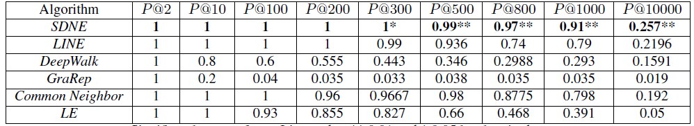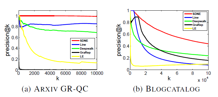 当 SDNE 的precision 仍然高于 0.9,而其它方法的 precision 掉到 0.8 以下。这表明 SDNE 对于排名靠前的链接预测的比较准。对于某些实际 application ,如推荐和信息检索,这种优势非常重要。因为这些应用更关心排名靠前的结果是否准确。