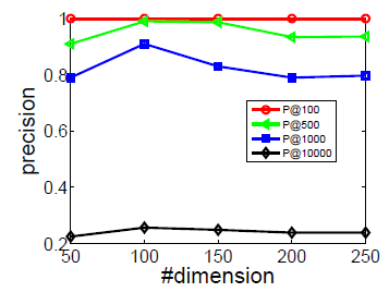 我们在本节中研究参数敏感性。具体而言,我们评估不同的 embedding 维度 ARXIV-GRQC 的数据集上报告 precision@k 指标。