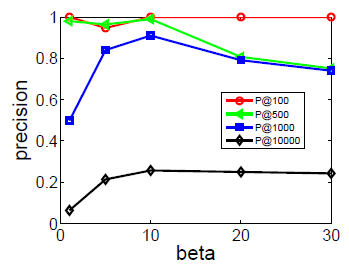 对于第一个实验,我们随机隐藏 15% 的现有链接(大约 4000 个链接),并使用 precision@k 作为预测隐藏链接的评估指标。我们逐渐将 2 增加到 10000,并在下表中报告结果。可以看到: