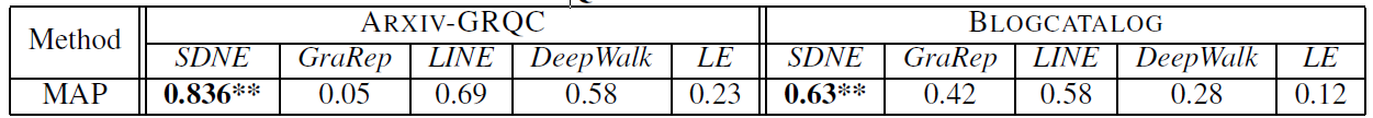 SDNE 在两个数据集上 MAP 指标始终超越其它baseline。当 SDNE 在两个数据集上 precision@k 始终最高。这表明我们的方法(即 SDNE )能够很好地保持网络结构。