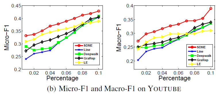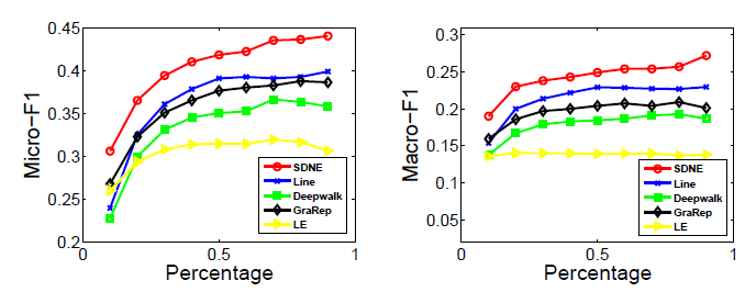 SDNE 的效果始终超越baseline 方法,证明SDNE 学到的 network representation 相比 baseline 可以更好地泛化到分类任务中。