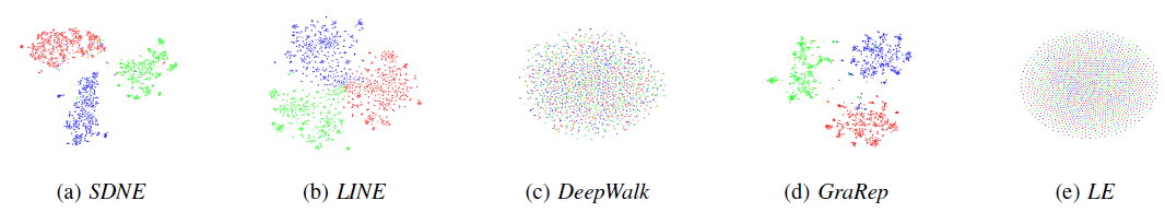 LE 和 DeepWalk 的效果较差,因为不同类别的顶点彼此混合。